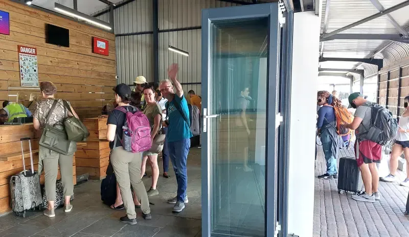 Nach etwa einer halben Stunde Transferfahrt brauchten wir quasi nur aus dem Auto zu purzeln und standen schon direkt vor unserem Check in Schalter. Unsere Koffer wurden alle zusammen gewogen. Da hätte sich unsere eine Teilnehmerin vorher gar nicht so einen Kopf um ihr Übergepäck machen müssen. (bei den Inlandsflügen waren nur 20kg gegenüber 23kg auf den internationalen Flügen erlaubt)