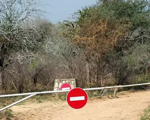 An dem gemauerten Pfosten eines Schlagbaums leckend stand ein Leopard!