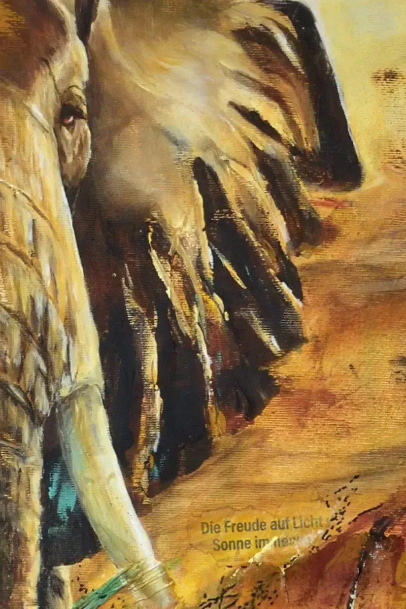 Wenn dann noch Elefanten und ihre mitreisenden Partner die Szene bereichern, ist das Erlebnis perfekt. So haben wir es im Murchison Falls Nationalpark in Uganda erlebt und ich musste diese wunderschöne Szene einfach in einem Gemälde festhalten.