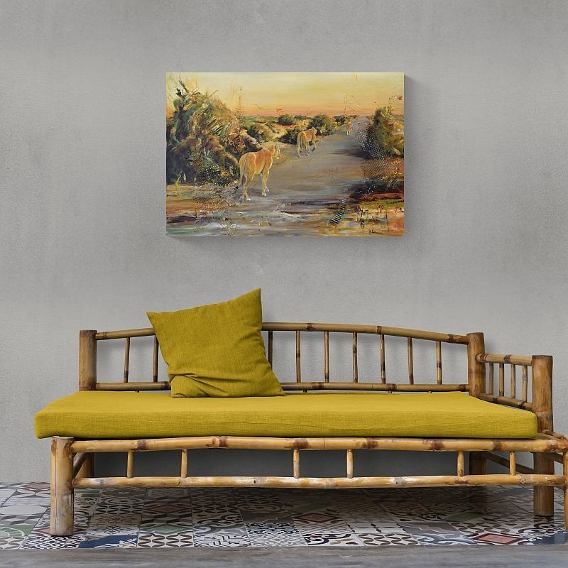 Sie blieben immer mal wieder stehen, um Witterung von möglicher Beute aufzunehmen und wir sahen ihr Fell rotgolden in den letzten Sonnenstrahlen des Tages glänzen. Die Stimmung dieser Szene ist mit Worten kaum zu beschreiben. Deswegen musste ich sie in einem Gemälde festhalten.